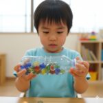 「へびつくったよ!」「アイスみたい!」など、自分の作品を見せてくれるお子さまも多く、創造力あふれる作品がたくさん生まれていました。職員が「色を混ぜるとどうなるかな?」と声かけをすると、「やってみる!」とさらに興味が広がる姿もあり、とても活気のある時間でした。
